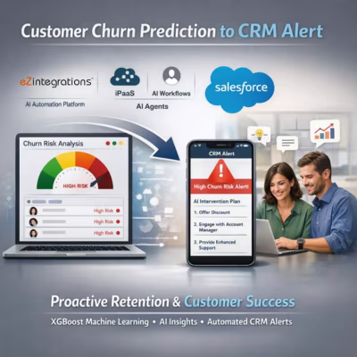 The AI churn prediction workflow from eZintegrations scores every customer account daily using a trained XGBoost ML model and pushes high-risk alerts directly to Salesforce CRM with AI-generated intervention plans — shifting Customer Success teams from reactive churn response to proactive retention. eZintegrations is an enterprise automation platform covering iPaaS, AI Workflows, AI Agents, and Goldfinch AI agentic automation.