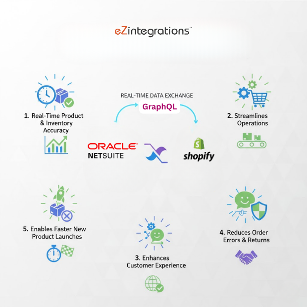 Seamlessly synchronize product, inventory, and pricing data between NetSuite ERP and Shopify using powerful GraphQL APIs. This no-code integration automates real-time data exchange, ensuring Shopify always reflects accurate and up-to-date information from NetSuite.