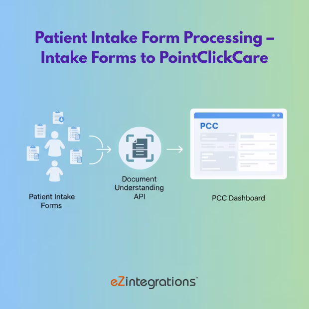 The system securely extracts patient details from digital or scanned intake forms, validates the information, and transforms it before syncing to PCC. This workflow ensures front desk and registration teams receive accurate patient data with minimal manual effort, reducing entry errors, improving onboarding speed, and enhancing overall registration efficiency.